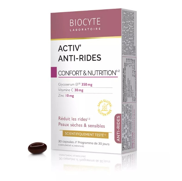 Nakon 25. godine počinju se pojavljivati prvi znakovi starenja, koje dodatno pogoršavaju hormonske promjene, onečišćenje i drugi vanjski čimbenici. Kako bi se koža ponovno hidratizirala iznutra i djelovalo u samom središtu epidermisa, laboratorij Biocyte razvio je ACTIV’ PROTIV BORA. Ovaj dodatak prehrani kombinira patentirani aktivni sastojak Glycoserum EF®, koji dokazano smanjuje bore i hidratizira kožu, s vitaminom C i cinkom koji doprinose održavanju normalne kože.