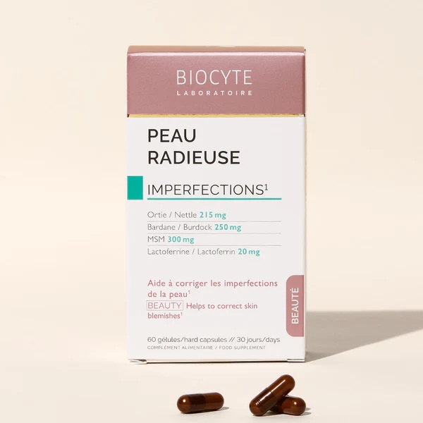 Prehransko dopolnilo PEAU RADIEUSE vrhunskega francoskega proizvajalca Biocyte je specifično oblikovano za pomoč pri pomoč pri popravljanju in odpravljanju nepravilnosti na koži ter ohranjanju zdrave kože. Zahvaljujoč edinstveni kombinaciji aktivnih učinkovin deluje to prehransko dopolnilo globinsko in pripomore k čistejši, bolj ravnovesni koži.